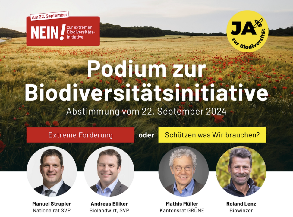 Am 14. August 2024 lädt die SVP Bezirk Frauenfeld zu einem spannenden Podium zur Biodiversitätsinitiative ein. Moderator Mathias Frei diskutiert mit den vier Gästen über Chancen und Herausforderungen.